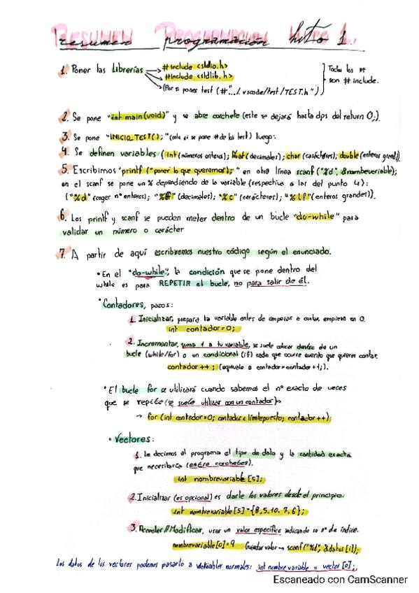 Resumen para Hito 1 (1º examen de prácticas) en base a los ejercicios realizados en Programación.