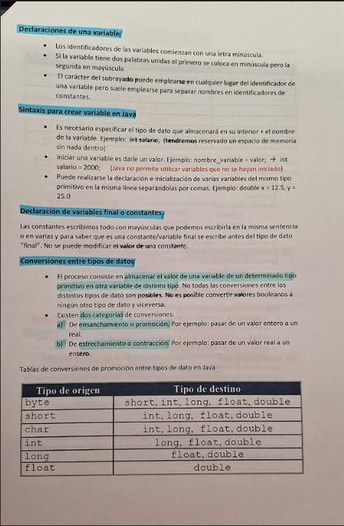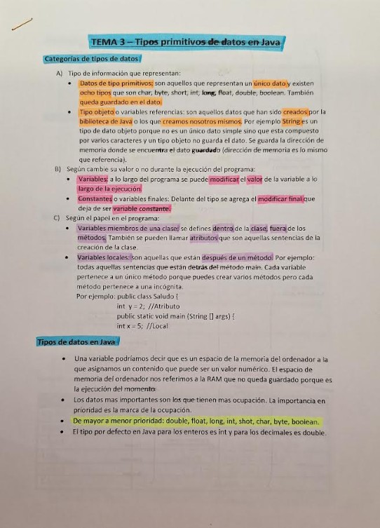 Se encuentra un resumen del Tema 3 sobre los tipos primitivos de datos en Java, donde al principio los apuntes se encuentran subrayados con lo más importante y al final el documento Word del tema.