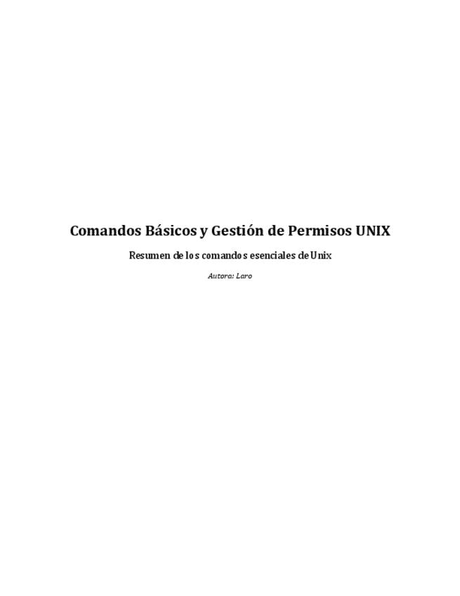 Guía rápida de comandos esenciales para terminal UNIX/Linux. Cubre navegación de directorios (cd, mkdir) , manipulación de ficheros (touch, echo, cp, mv) y visualización de contenido (ls). Incluye una sección fundamental sobre la gestión de permisos (chmo