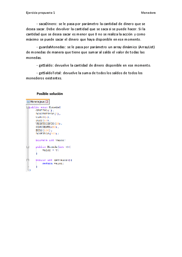 Ejercicio propuesto que consiste en implementar unas clases que simulen un monedero.