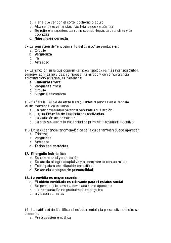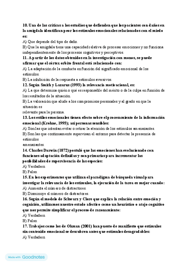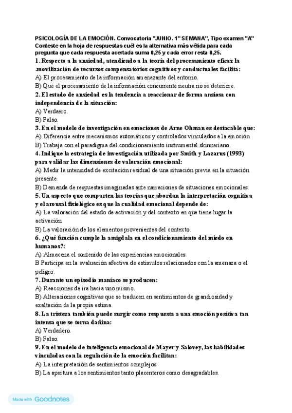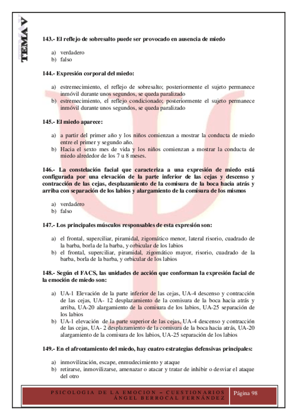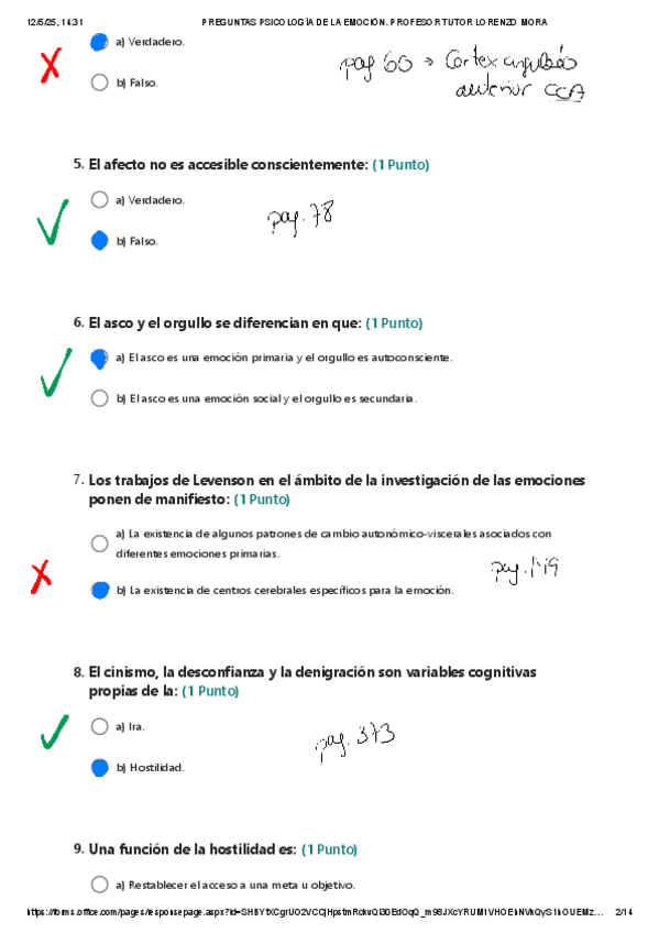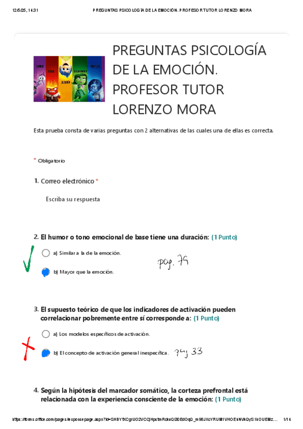 Preguntas del cuestionario de psicología de la emoción del tuto Lorenzo Mora corregidas, incluye número de página de libro donde encontrar la respuesta.