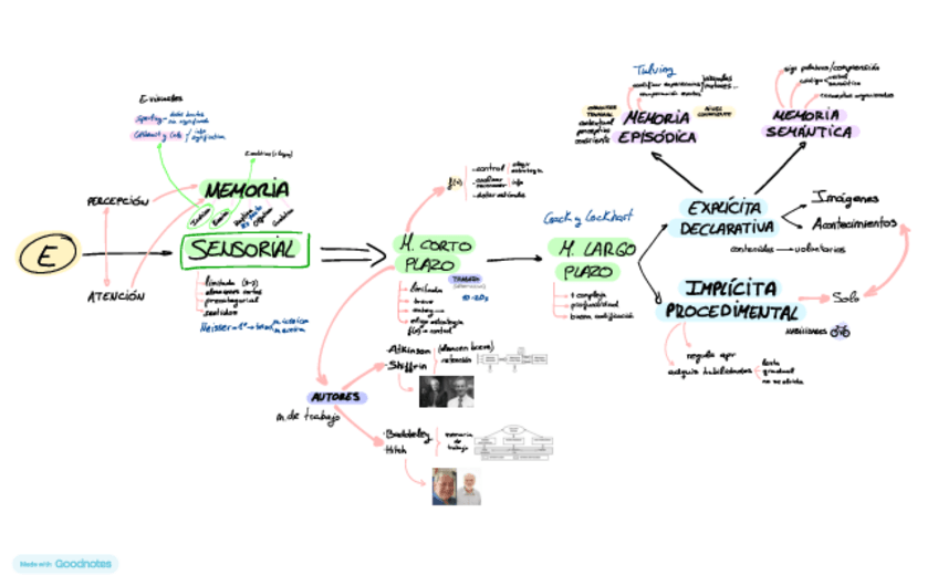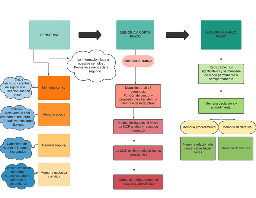 Este pdf cuenta con tres esquemas completos sobre los distintos tipos de memoria (sensorial, a corto plazo y a largo plazo). Es mejor estudiarlos desde tablet/movil/ordenador para poder hacerle zoom (igual algunas cosas si se imprimen se ven mal o pequeña