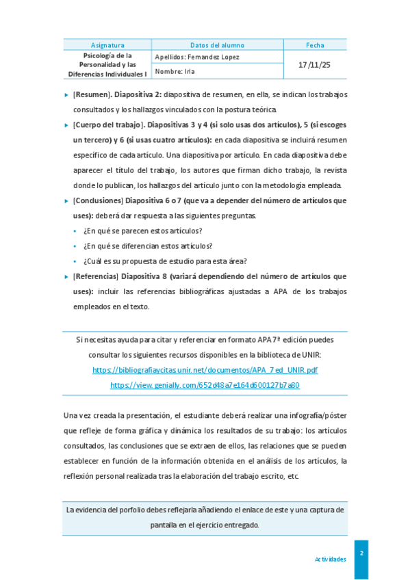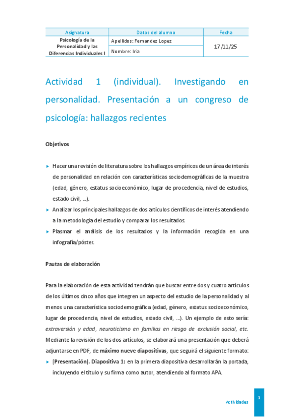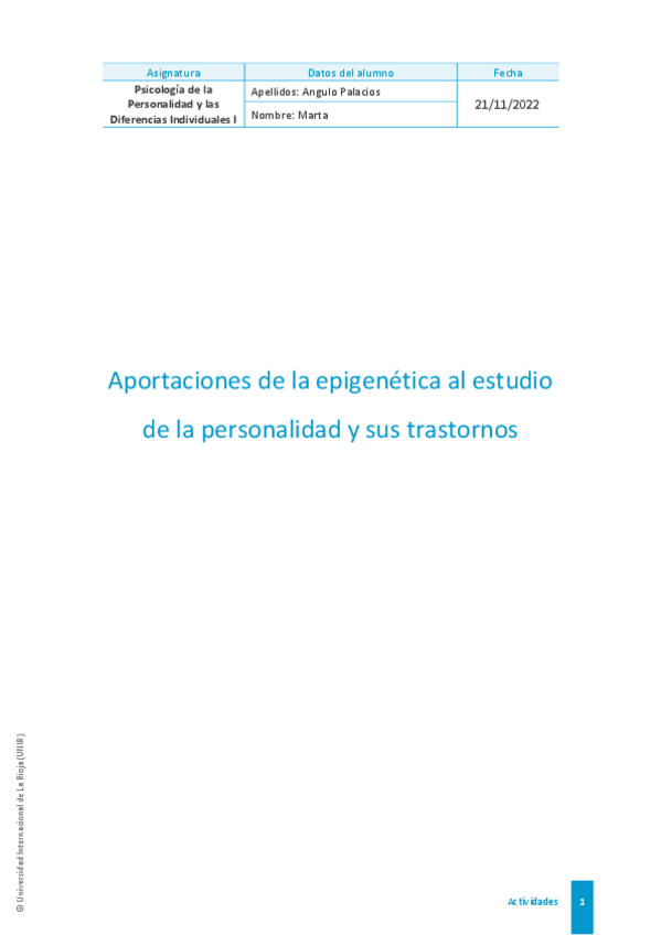 Actividad individual 1 de psicología de la personalidad y las diferencias individuales I El contenido de este archivo es propiedad intelectual de @Dzhuliii. Su finalidad es el apoyo al estudio. Queda prohibida su reproducción o uso con fines comerciales.