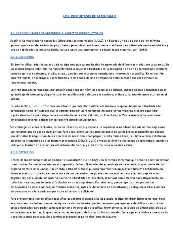 Resumen completo UD6 (Dificultades de aprendizaje) de Psicología del Aprendizaje