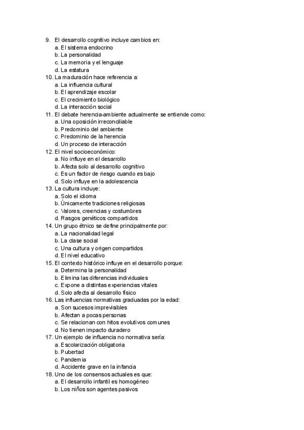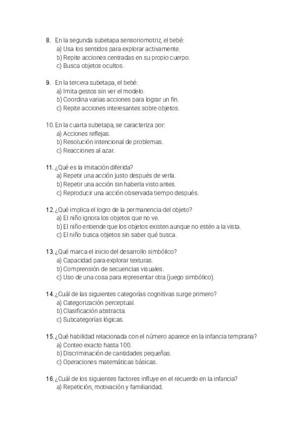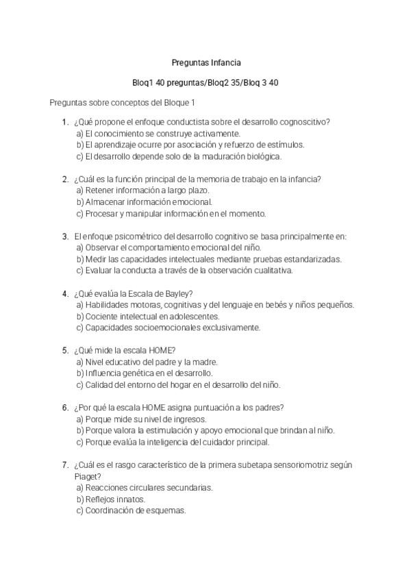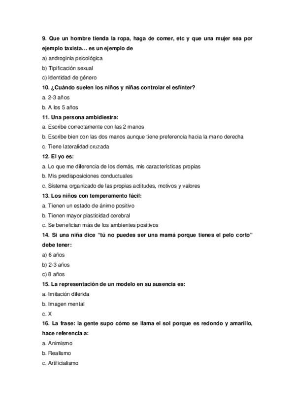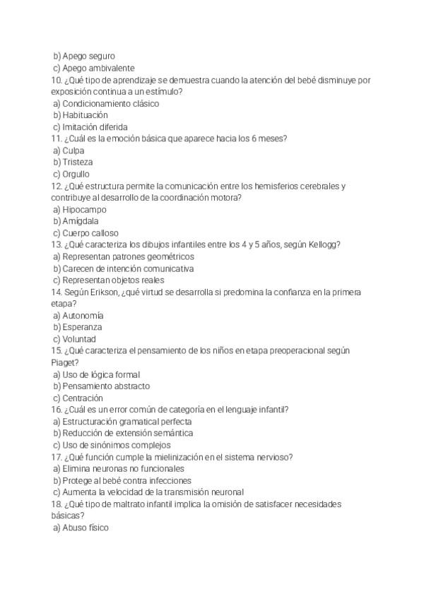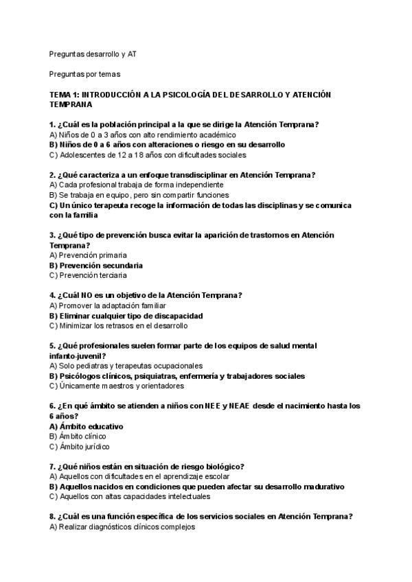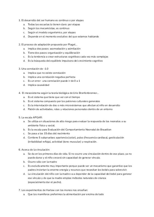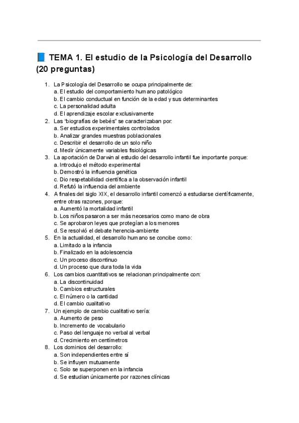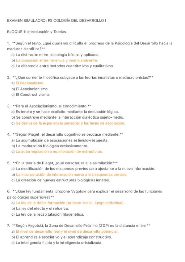 Tipo test resueltos de la asignatura de Psicología del Desarrollo I, orientados para el examen de este año 2025/2026, incluye el tema 1 del ágora (no el tema 1 y 2 del manual como se especifica en el ágora), hasta el tema 7.