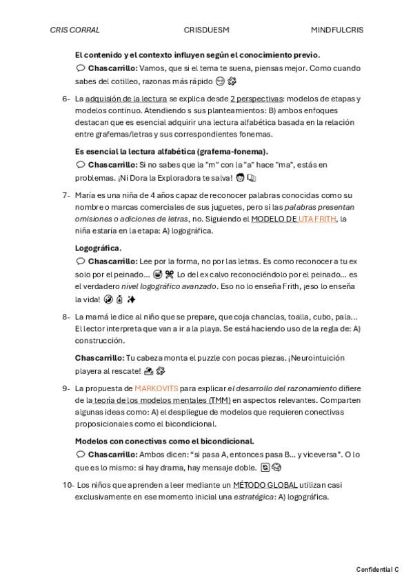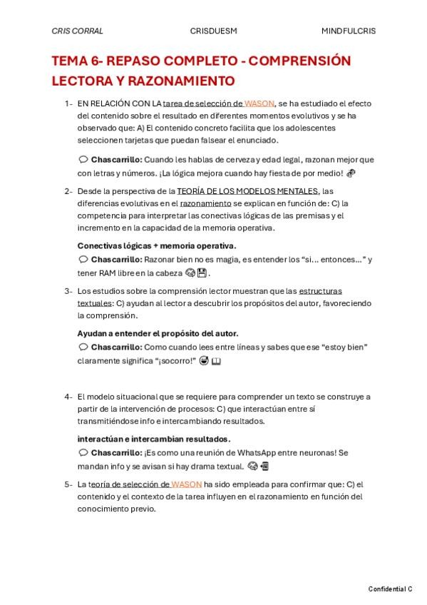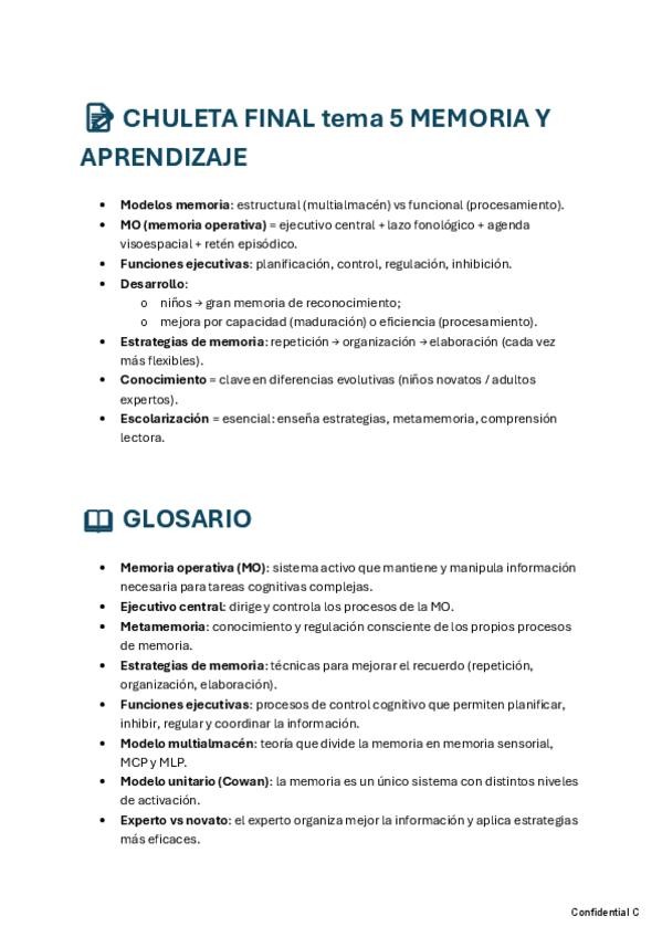Resumen, apartado de autores, glosario, chuleta final y 10 preguntas tipo test con la correcta señalada.