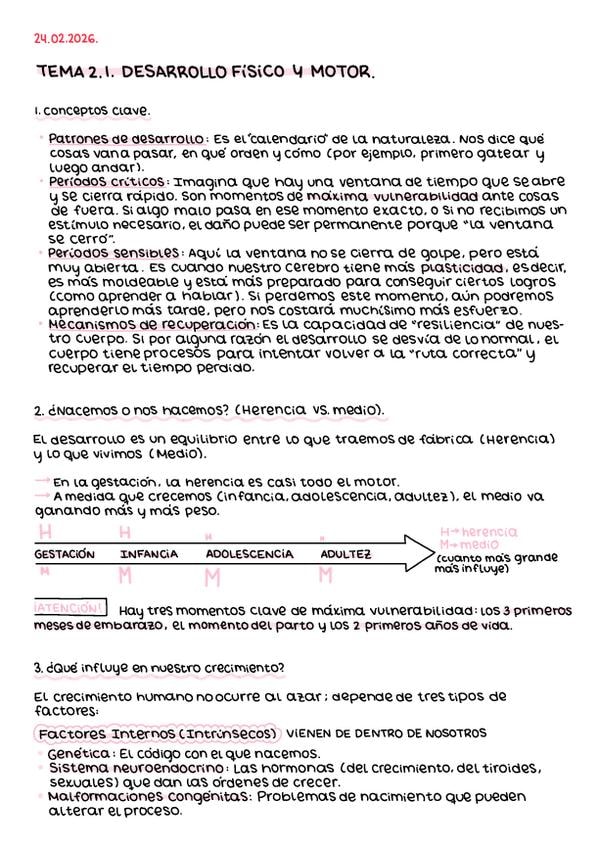 Tema dos súper bien explicado, dividido en dos partes: desarrollo físico y motor, y evolución del desarrollo físico y motor.