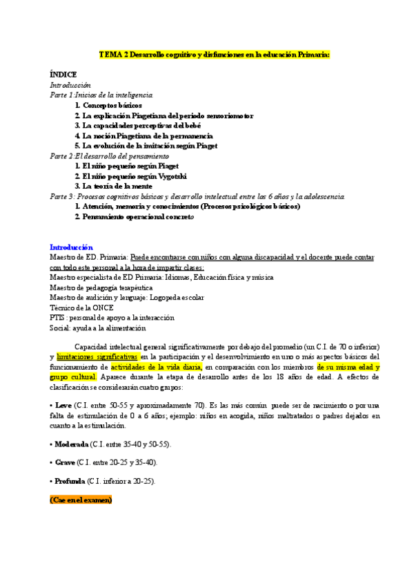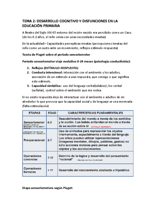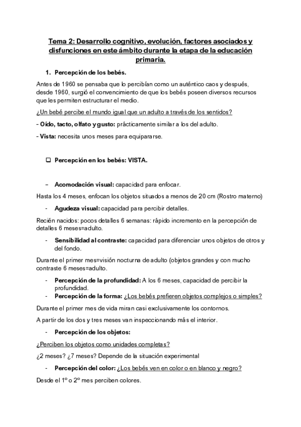Resumen del tema 2 (desarrollo cognitivo y disfunciones en la Educación Primaria) de la asignatura Psicología del Desarrollo (1er cuatri 1er curso)