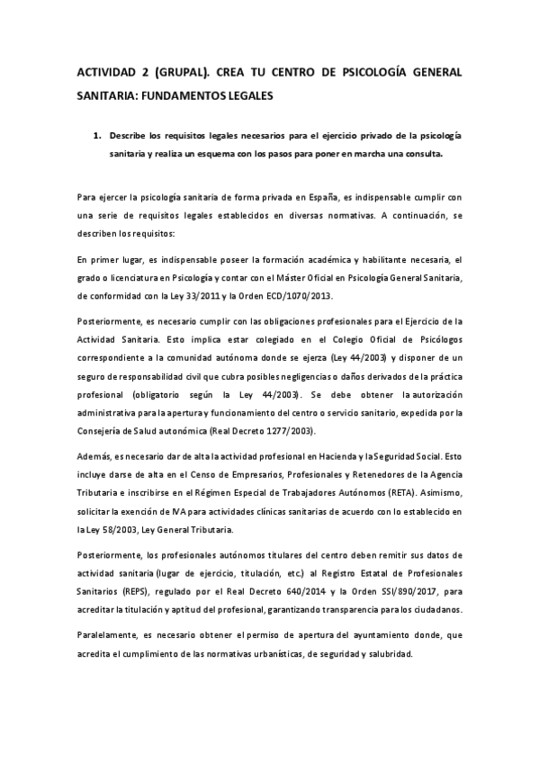Actividad 2 (grupal). Crea tu centro de psicología general sanitaria: fundamentos legales. Nota: 10 Comentario profesor: ¡Fenomenal, Equipo! Tiene todo lo que tiene que tener... y (muy) bien. GUILLERMO PARRA LORENZO