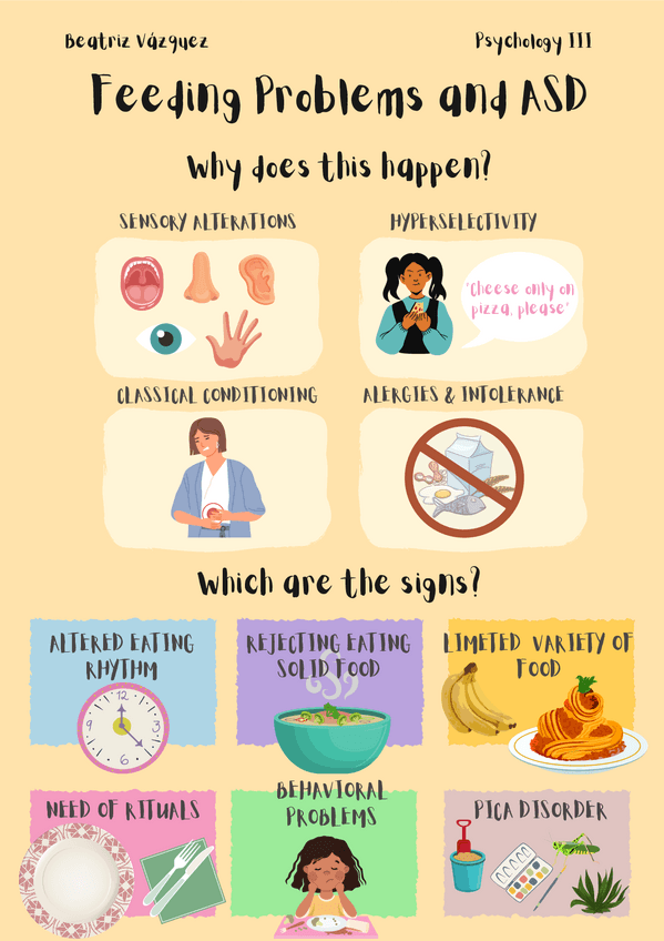 Poster que explica los problemas de los niños con TEA y la comida, además de dar consejos sobre qué hacer al respecto.