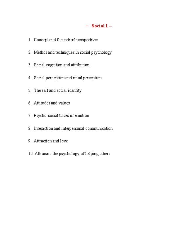1. Concept and theoretical perspectives 2. Methds and techniques in social psychology 3. Social cognition and attribution 4. Social perception and mind perception 5. The self and social identity 6. Attitudes and values 7. Psycho-social bases of emotion 8.