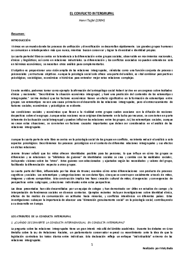 Resumen, explicación y conclusión, e ideas principales del texto 'El Conflicto Intergrupal' de Tajfel.