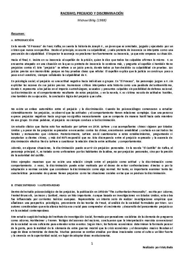 Resumen, explicación y conclusión, e ideas principales del texto 'Racismo, Prejuicio y Discriminación' de Billig.