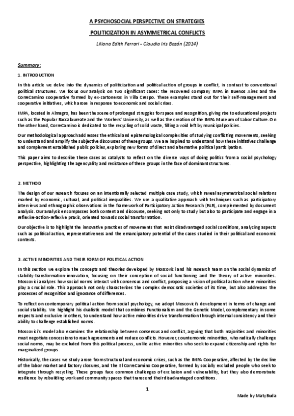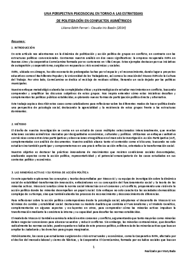 Resumen, explicación y conclusión, e ideas principales del texto 'Una Perspectiva Psicosocial en Torno a las Estrategias de Politización en Conflictos Asimétricos' de Ferrari y Bazán