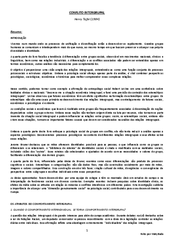 Resumo, explicação e conclusão das ideias principais do texto 'Conflito Intergrupal' por Tajfel.