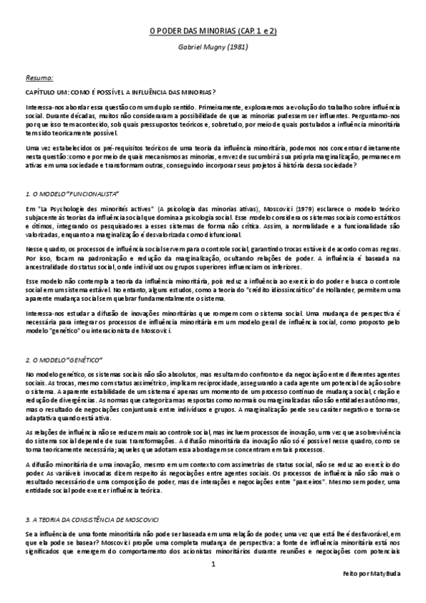 Resumo, explicação e conclusão das ideias principais do texto 'O Poder das Minorias (Cap. 1 e 2)' por Mugny.