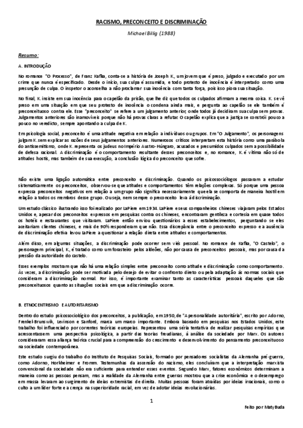 Resumo, explicação e conclusão das ideias principais do texto 'Racismo, Preconceito e Discriminação' de Billig.