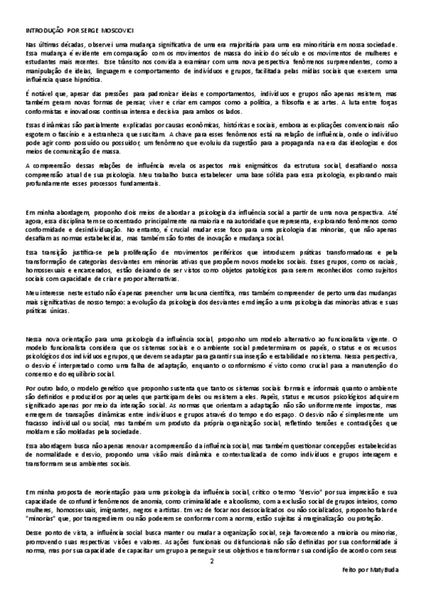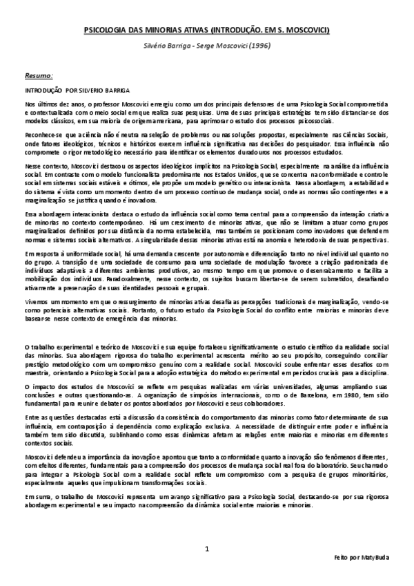 Resumo, explicação e conclusão das ideias principais do texto 'Psicologia das Minorias Ativas (Introdução)' por Barriga e Moscovici.