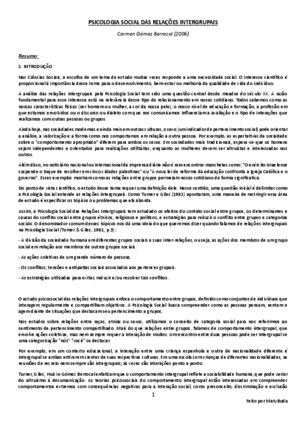 Resumo, explicação e conclusão das ideias principais do texto 'Psicologia Social das Relações Intergrupais' por Gómez Berrocal.