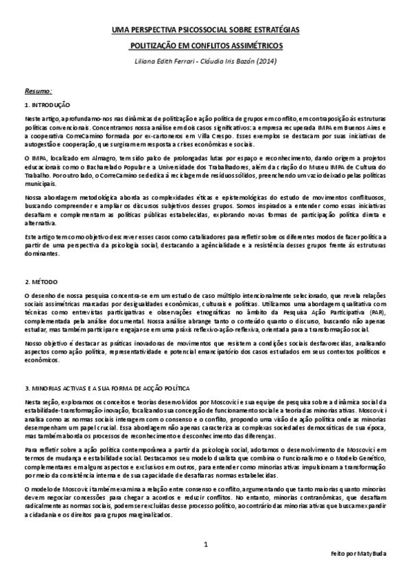 Resumo, explicação e conclusão das ideias principais do texto 'Uma Perspectiva Psicossocial em Torno das Estratégias de Politização em Conflitos Assimétricos' de Ferrari e Bazán.