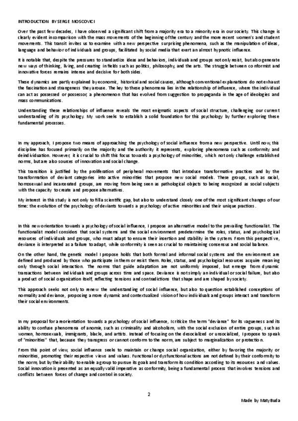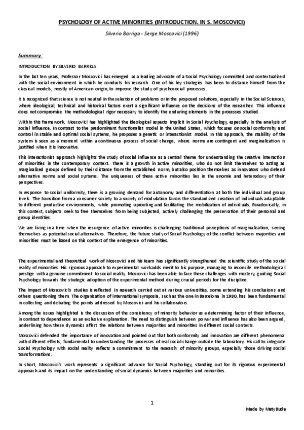 Summary, explanation and conclusion of the main ideas of the text 'Psychology of Active Minorities (Introduction)' by Barriga and Moscovici.