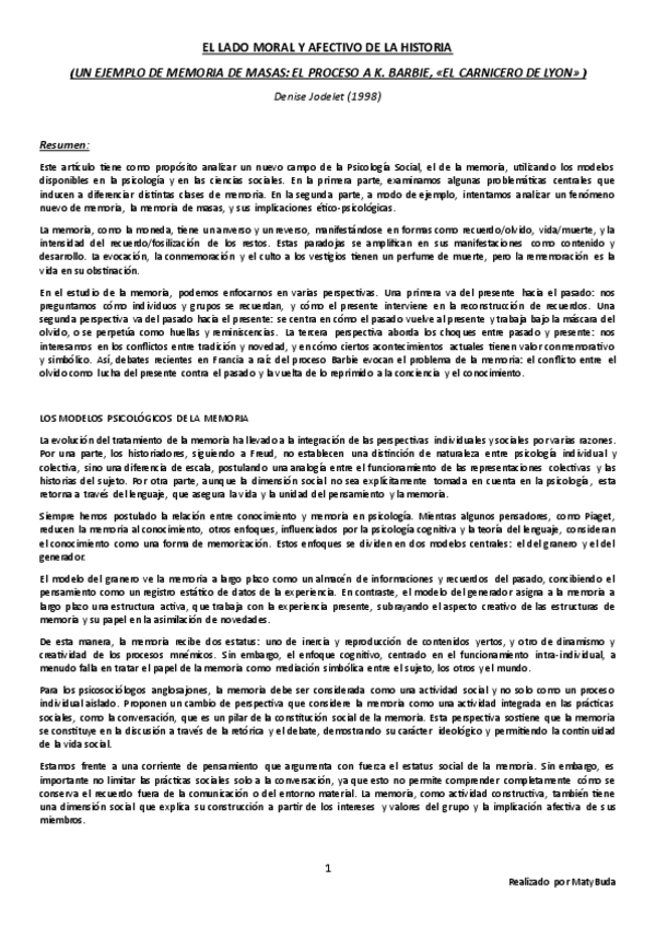 Resumen, explicación y conclusión, e ideas principales del texto 'El Lado Moral y Afectivo de la Historia' de Jodelet.