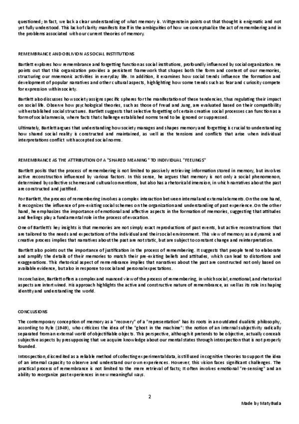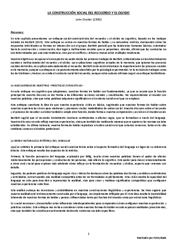 Resumen, explicación y conclusión, e ideas principales del texto 'La Construcción Social del Recuerdo y el Olvido' de Shotter.