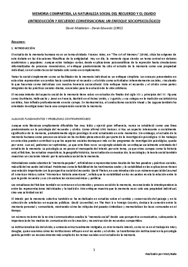 Resumen, explicación y conclusión, e ideas principales del texto 'Memoria Compartida, la Naturaleza Social del Recuerdo y el Olvido (Introducción y Cap. 2)' de Middleton y Edwards.