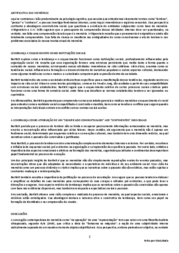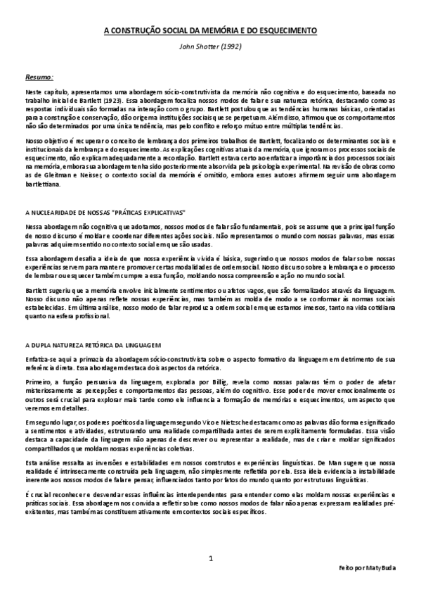Resumo, explicação e conclusão das ideias principais do texto 'A Construção Social da Memória e do Esquecimento' de Shotter.