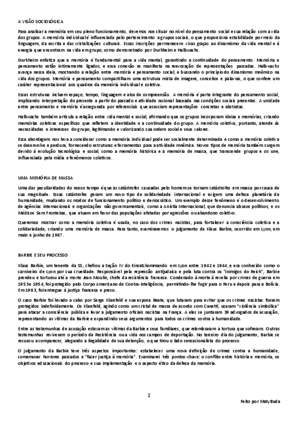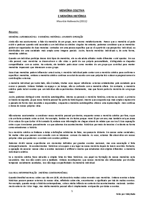 Resumo, explicação e conclusão das ideias principais do texto 'Memória Coletiva e Memória Histórica' por Halbwachs.