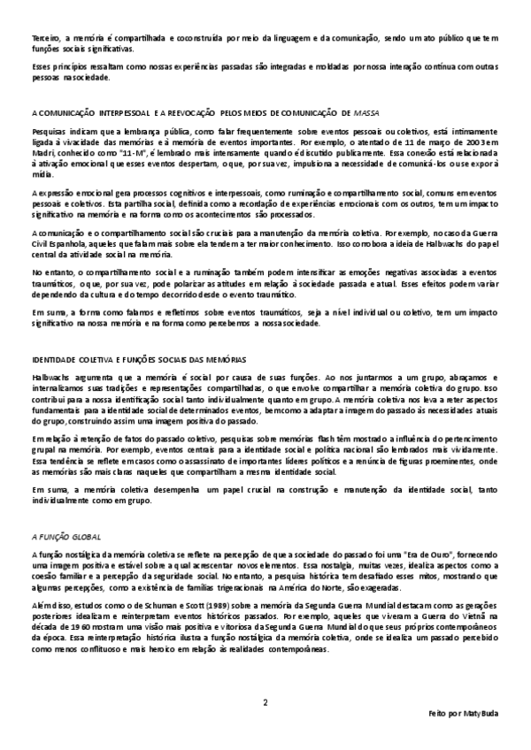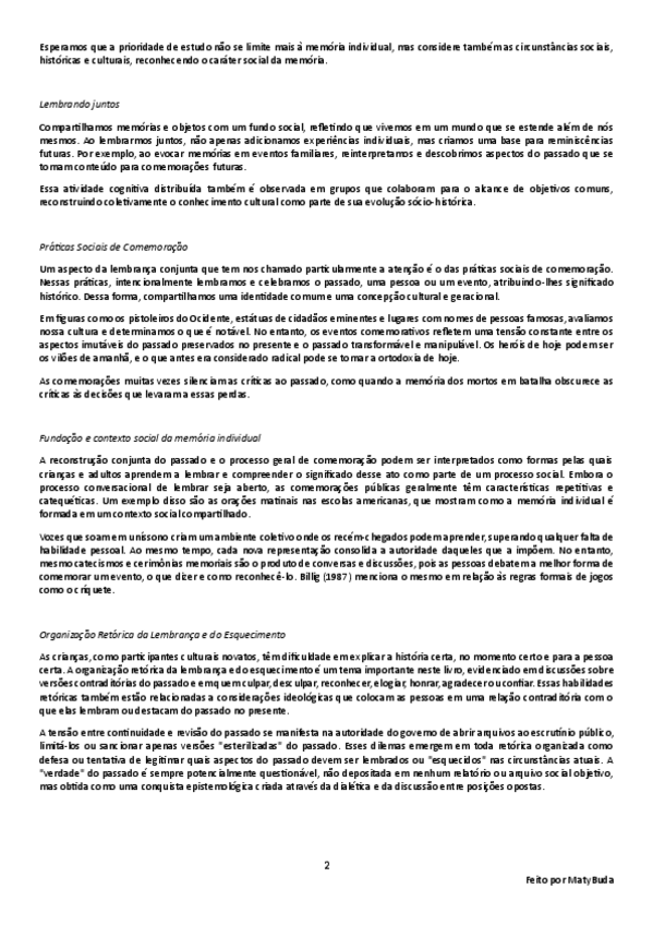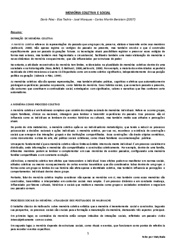 Resumo, explicação e conclusão das ideias principais do texto 'Memória Coletiva e Social' por Páez, Techio, Marques e Beristain.