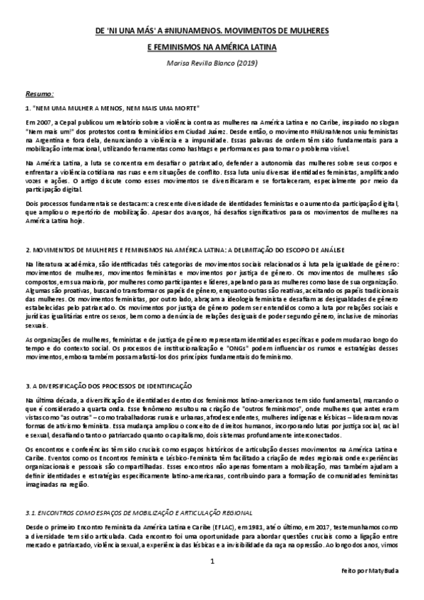 Resumo, explicação e conclusão das ideias principais do texto 'De 'Ni una Más' a #NiUnaMenos. Movimentos de Mulheres e Feminismos na América Latina' de Revilla Blanco.