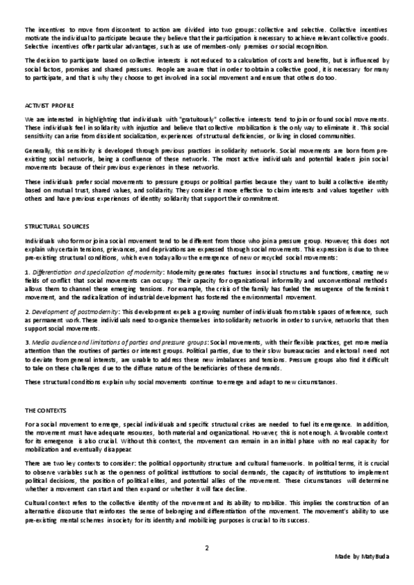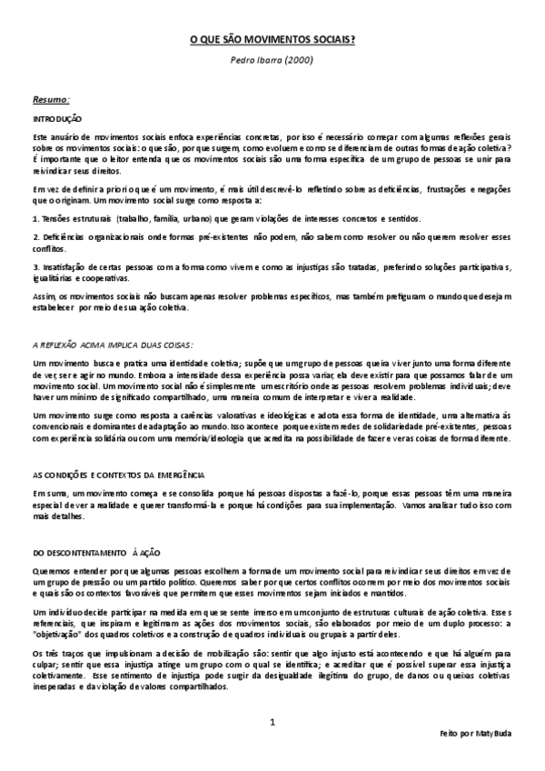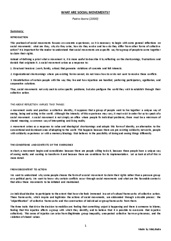 Summary, explanation and conclusion of the main ideas of the text 'What are Social Movements' by Ibarra.