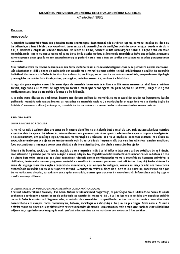 Resumo, explicação e conclusão das ideias principais do texto 'Memória Individual, Memória Coletiva, Memória Nacional' de Siedl.