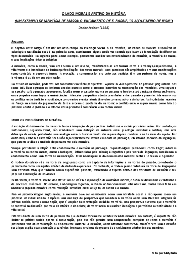 Resumo, explicação e conclusão das ideias principais do texto 'O Lado Moral e Afetivo da História' de Jodelet.