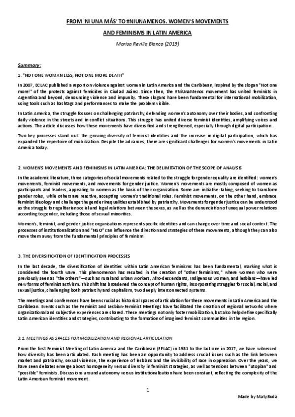 Summary, explanation and conclusion of the main ideas of the text 'From 'Ni una Más' to #NiUnaMenos. Women's Movements and Feminisms in Latin America' by Revilla Blanco.