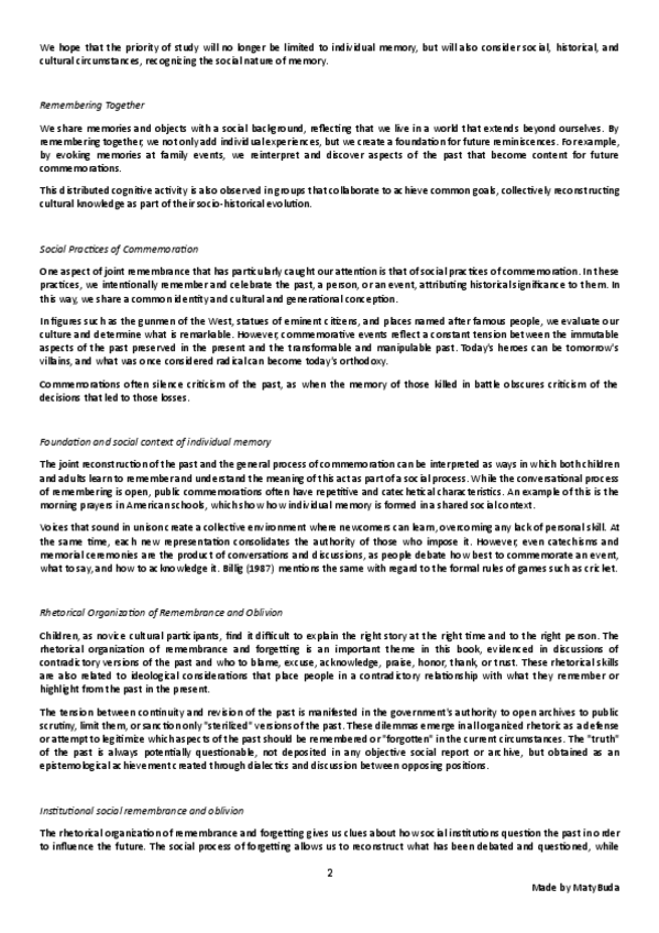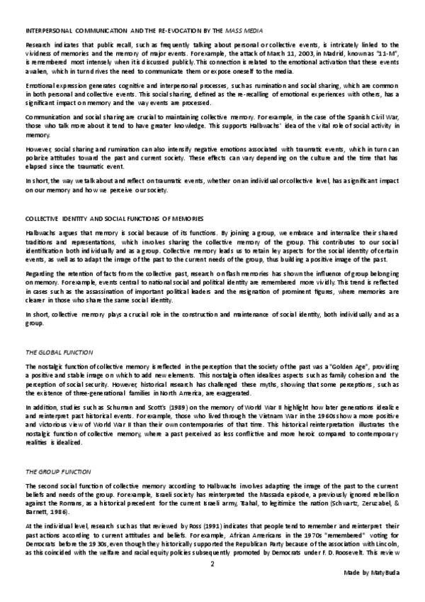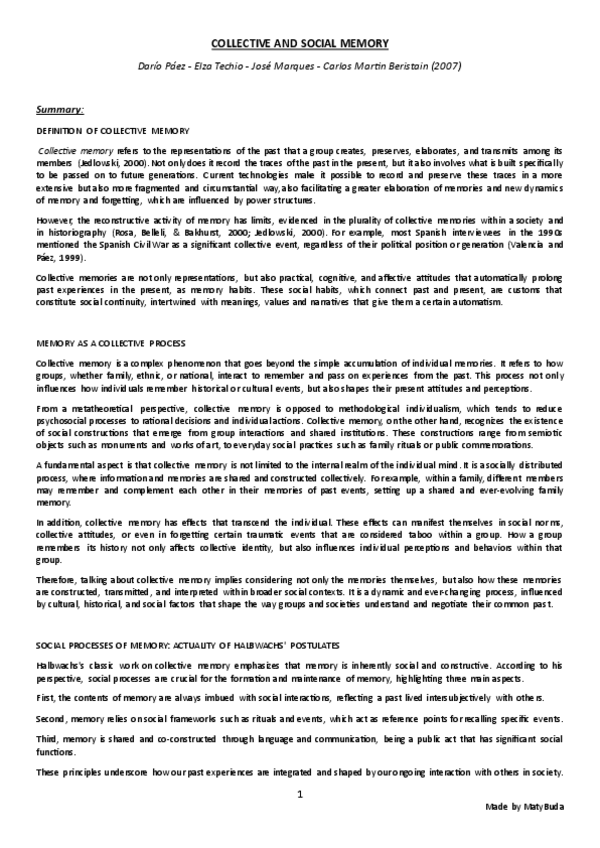 Resumen, explicación y conclusión, e ideas principales del texto 'Memoria Colectiva y Social' de Páez, Techio, Marques y Beristain.