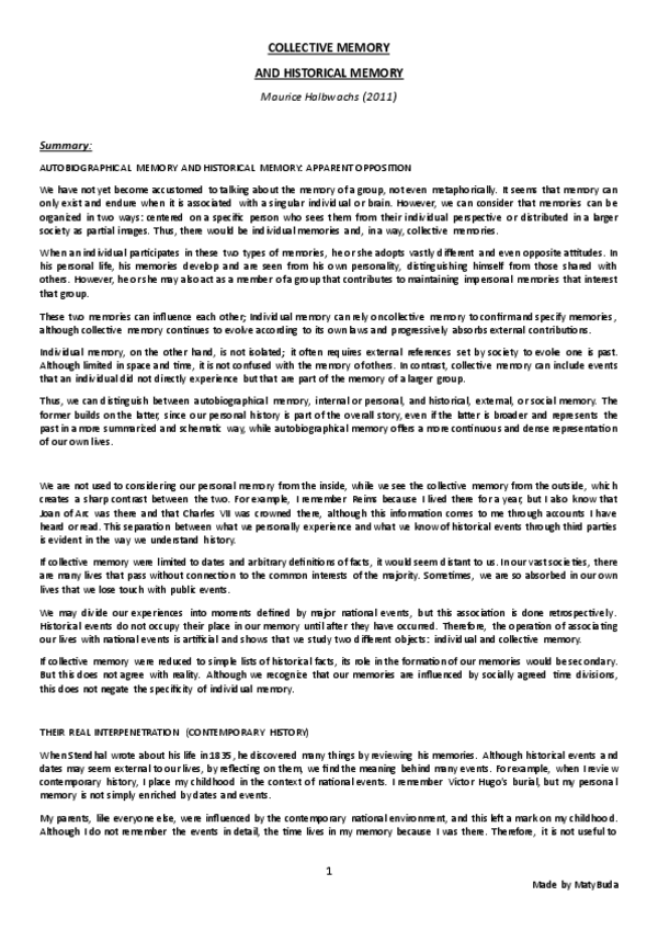 Summary, explanation and conclusion of the main ideas of the text 'Collective Memory and Historical Memory' by Halbwachs.
