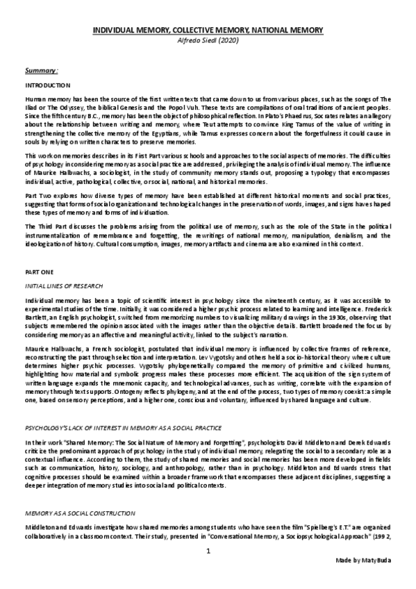 Summary, explanation and conclusion of the main ideas of the text 'Individual Memory, Collective Memory, National Memory' by Siedl.