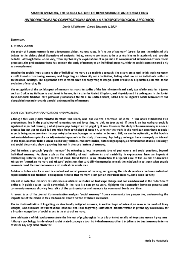 Summary, explanation and conclusion of the main ideas of the text 'Shared Memory, the Social Nature of Remembering and Forgetting (Introduction and Chapter 2)' by Middleton and Edwards.