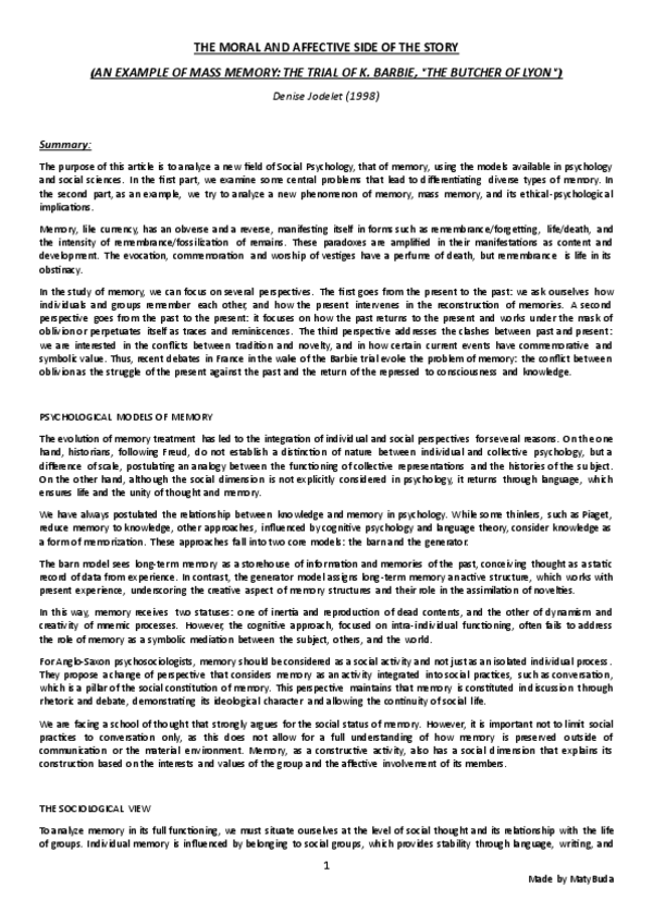 Summary, explanation and conclusion of the main ideas of the text 'The Moral and Affective Side of History' by Jodelet.