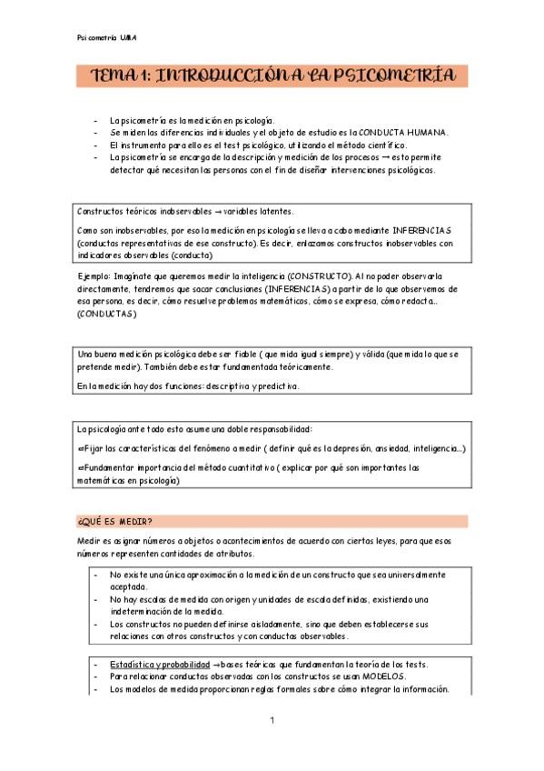 Resumen de la teoría del tema 1 y 2 de Psicometría, de los aspectos más importantes.