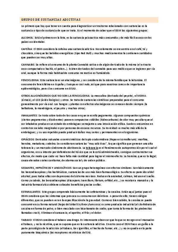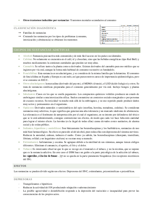 Esquema con todas las sustancias por tipos y lo que producen (t. por consumo, abstinencia e intoxicación)