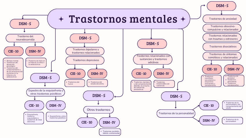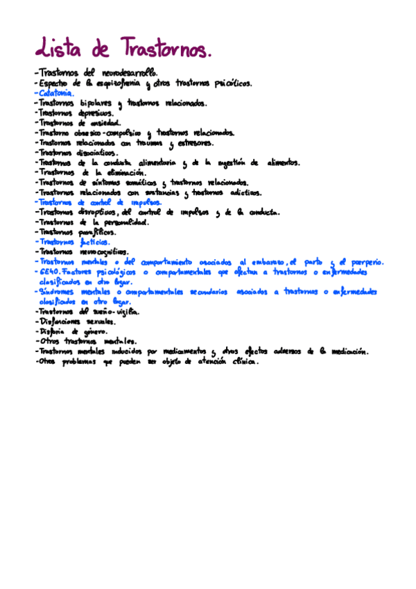 Los trastornos en azul son los que solo se encuentran en el CIE-11, el resto pueden encontrarse en ambos pero en la lista solo están con el nombre del dsm-5