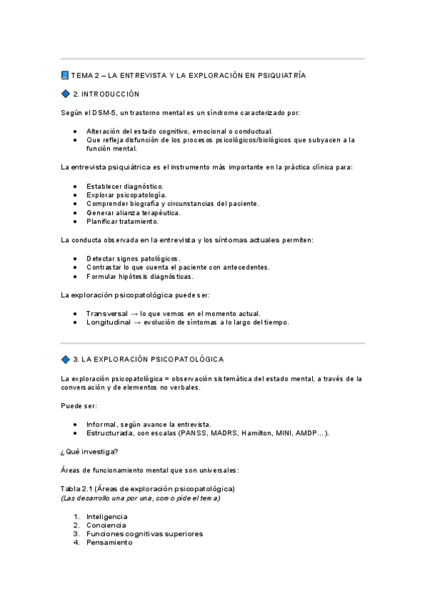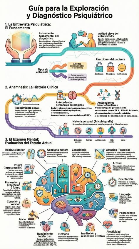 La Exploración Clínica abarca desde la técnica de entrevista hasta las herramientas diagnósticas avanzadas, todo explicado de forma clara y esquemática. 1.- Entrevista Psiquiátrica: Aprende por qué es el instrumento fundamental y cómo construir una alianz
