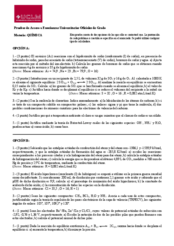Recopilación de ejercicios de Química de la PAU/EBAU desde 2004 hasta 2025, organizada para practicar los contenidos clave de 2º de Bachillerato. Incluye problemas tipo examen sobre equilibrio, termoquímica, ácido-base, redox, cinética, estructura atómica
