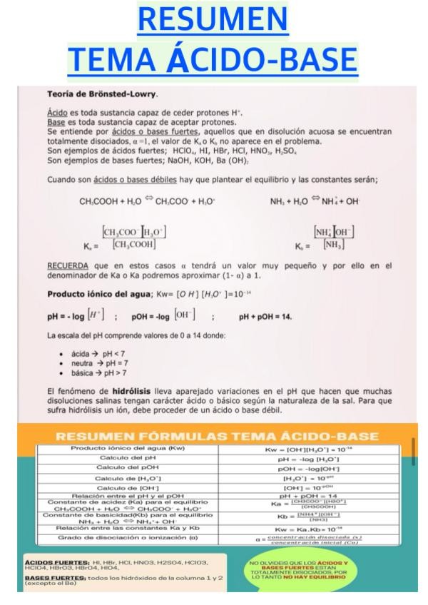Resumen del tema ácido-base. Encontrarás todas las fórmulas para resolver los problemas.
