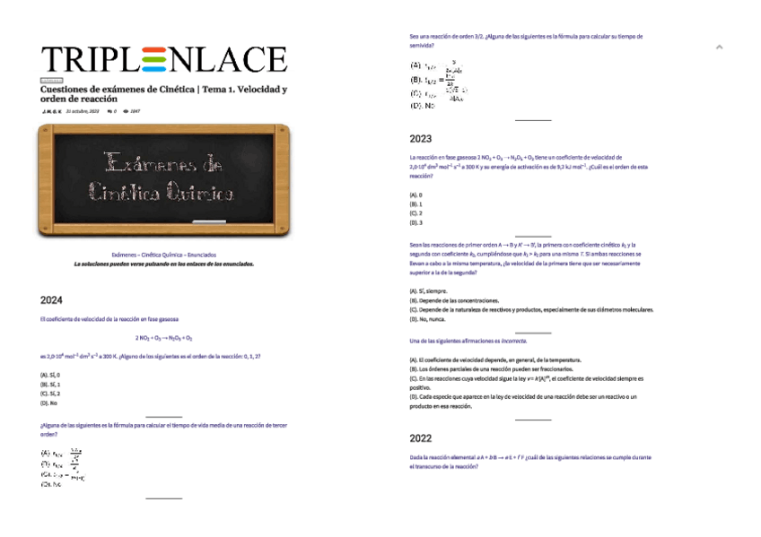 He publicado nuevos ejercicios de 3º Química Física IIi: Cinética y Electroquímica: Ejercicios-Tema-1-QF-III-2.pdf