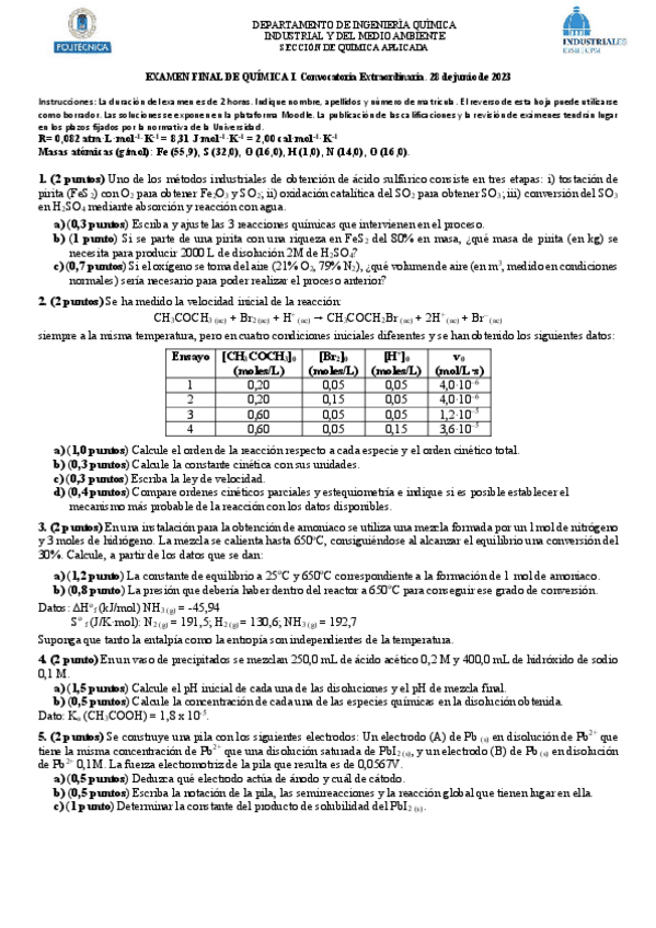 Enunciados de los exámenes de las dos partes de química 1 en enero de 2024: PE-1 y PE-2.