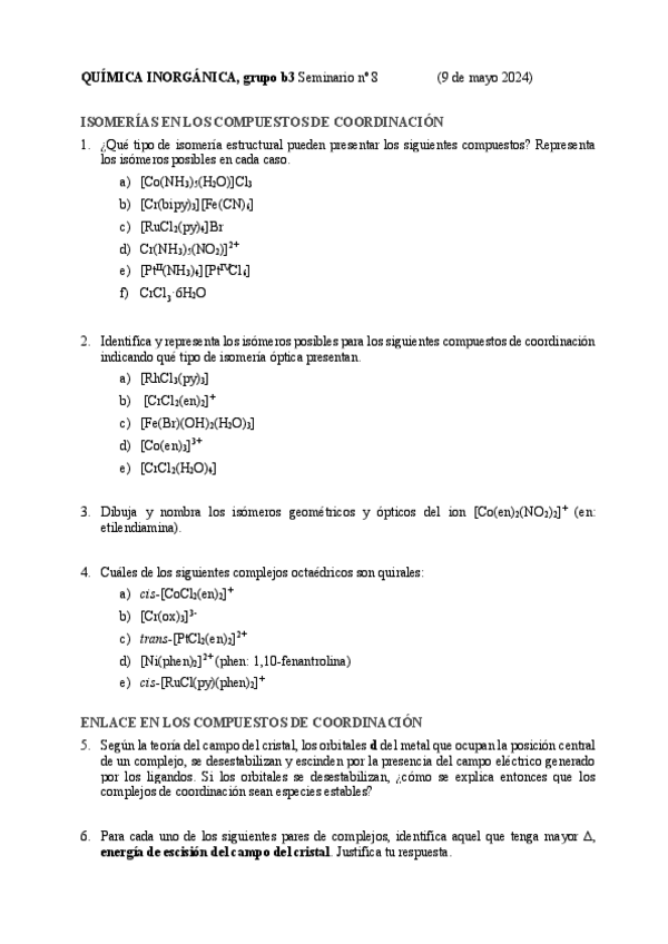 He publicado nuevos apuntes de 2º Química Inorgánica I: Ejercicios-Compuestos-de-coordinacion-Geometria-e-isomeria-2024-03-26-165400.pdf
